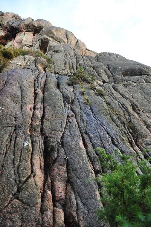 Startar i sprickorna mellan en buskarna längst till höger på klippans högsta del. Följ de högra sprickorna till hyllan. Därifrån den högra högerlutande sprickan till toppen.