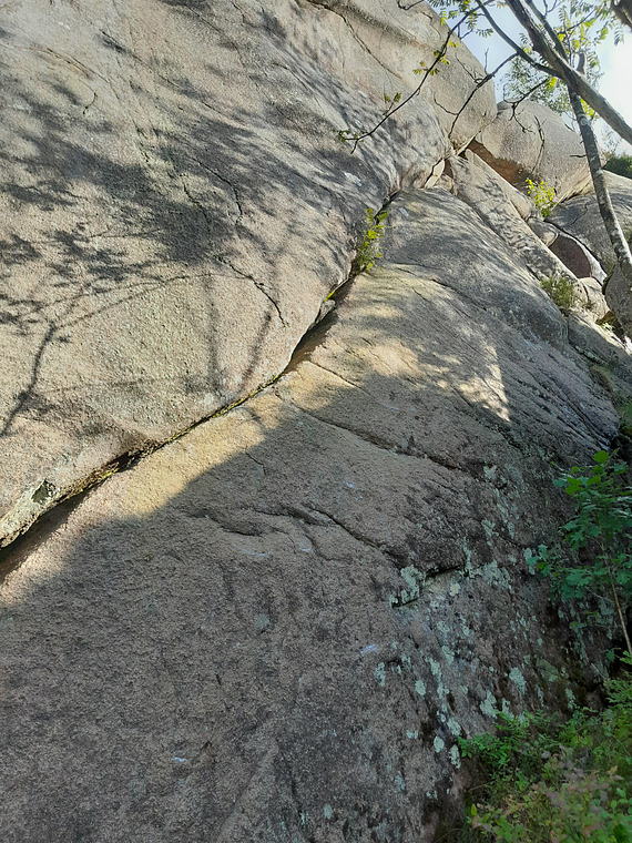 Sprickan startar från marken med en tydlig dragning åt höger, utsteg via sprickan i överhängets vänstra kant.
